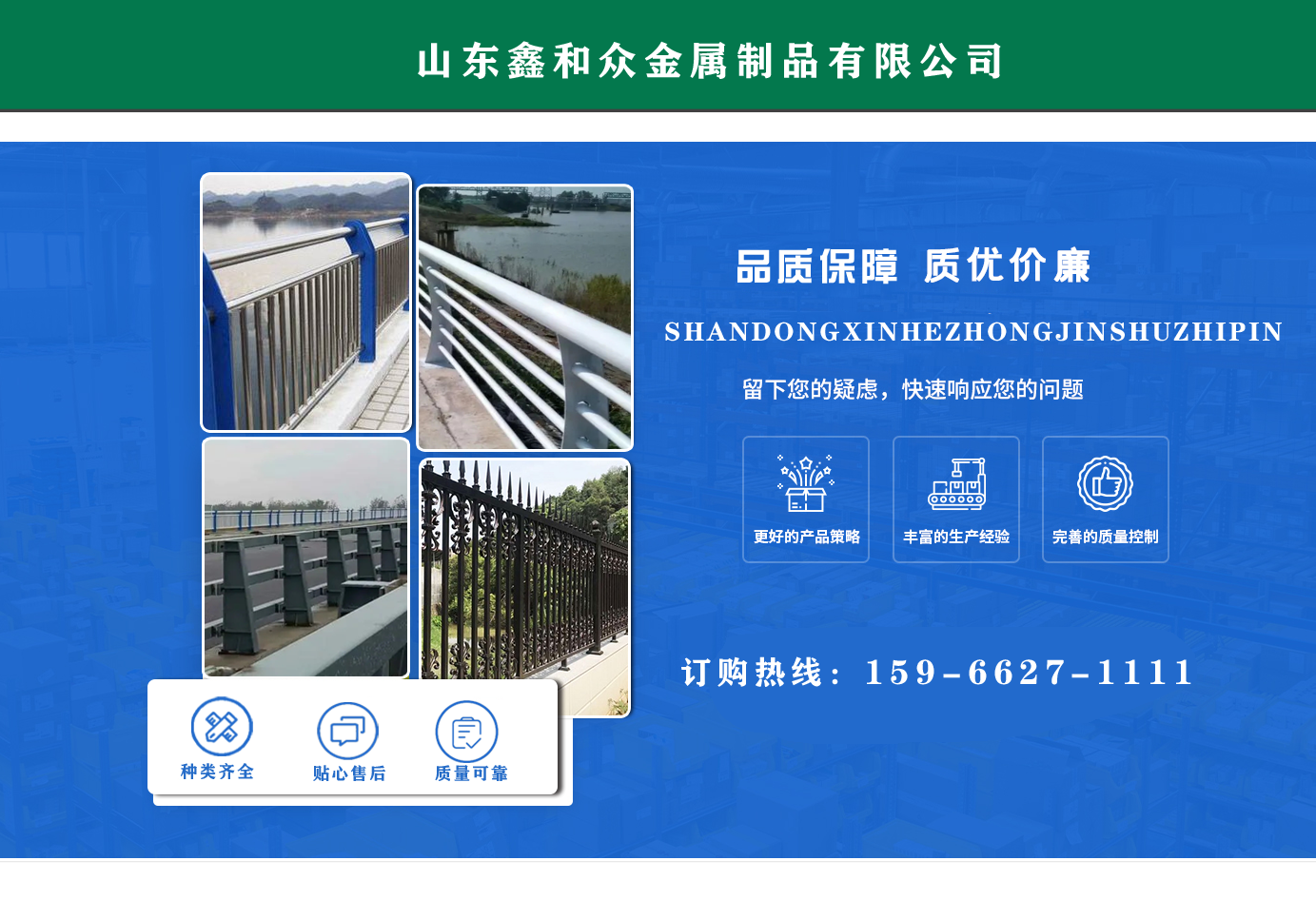 山東鑫和眾金屬制品有限公司主要產(chǎn)品有防撞護欄,橋梁護欄,道路護欄,河道護欄,不銹鋼護欄等護欄。提供設計方案,一站式定制,包您滿意價格優(yōu)惠,歡迎來電咨詢! 公司常年從事銷售護欄防撞護欄,橋梁護欄,道路護欄,河道護欄,不銹鋼護欄,橋梁鋼護欄,河道燈光護欄等。產(chǎn)品廣泛應用于橋梁、河道、旅游景區(qū)、道路、公路、公園、小區(qū)、景觀、道路防撞等領域。 公司產(chǎn)品均采用優(yōu)質(zhì)不銹鋼材料,符合相關標準。各種型號不銹鋼復合管及護欄,質(zhì)量嚴格把控。產(chǎn)品強度高、耐腐蝕、焊接牢固、抗沖擊、性能好,防撞護欄結構簡單、美觀實用大方?! g迎前來訂購!...